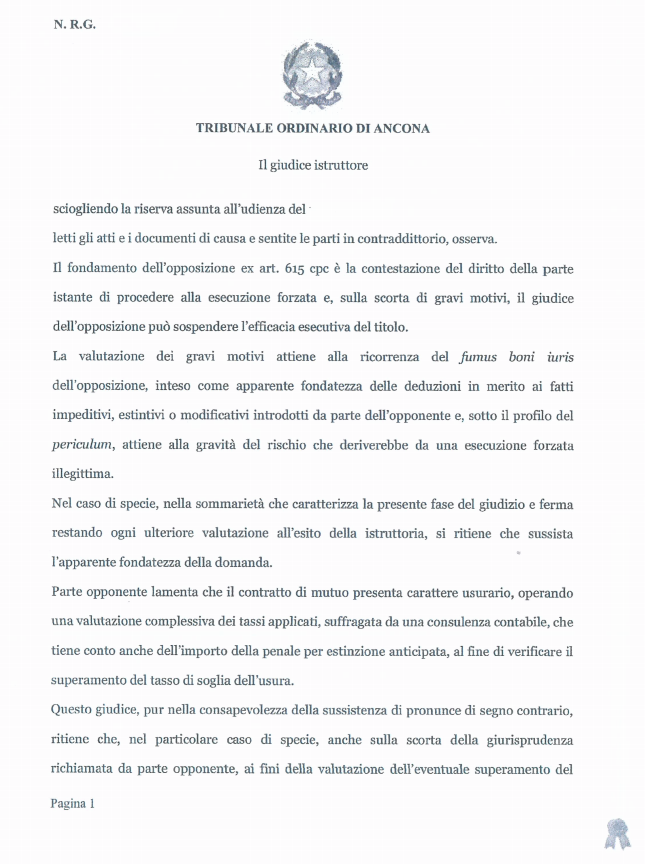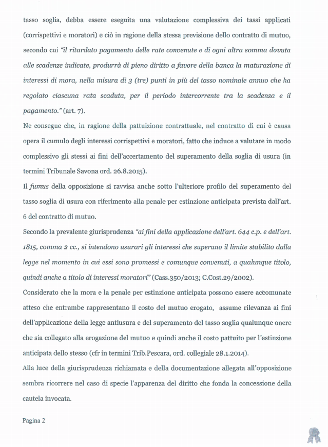 Il Giudice ha sposato totalmente le tesi dell’Avv. Paone, facendo una valutazione complessiva dei tassi pattuiti (corrispettivi e moratori) al fine della verifica del superamento del tasso soglia, disponendo la sospensione immediata dell’efficacia esecutiva del titolo.