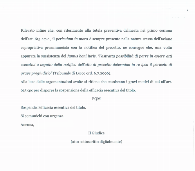 Tribunale di Ancona – Sospensione Efficacia del Titolo Esecutivo